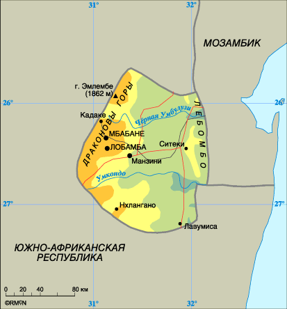 Общая длина государственной границы составляет 535 км, с Мозамбиком — 105 км, ЮАР — 430 км. Самая высокая точка — г. Эмлембе (Emlembe) 1862 м.