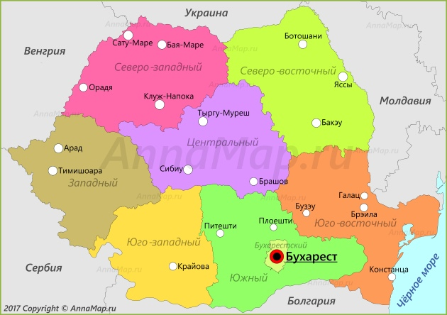 Экономика. Структура экономики Румынии в XX веке представляла собой по большей части именно добывающую и обрабатывающую промышленность. В стране и по сей день добывают драгоценные металлы, руды, нефть и газ. Однако добытого газа уже не хватает даже для удовлетворения собственных потребностей, а нефти в недрах осталось довольно мало (не более 80 млн. тонн). Поэтому промышленность Румынии на данный момент представляет машиностроение. Dacia — наиболее влиятельный производитель автомобилей в стране с 1966 года, привносит в румынскую экономику 4,5 млрд. евро ежегодно. Сельское хозяйство в Румынии представлено плантациями кукурузы и пшеницы – ими засеяно около 70 % всей пахотной земли. Выращивается также картофель, свекла. На Карпатах выращиваются такие фрукты: груши, яблоки, сливы. Административное деление. Румыния разделена на 8 регионов развития, которые непосредственно не являются административными единицами, а служат для координации регионального развития. Регионы развития разделены на 41 жудец и 1 муниципий. Жудецы разделены на 2686 коммун (в сельской местности) и 256 муниципиев. Коммуны и муниципии являются минимальными административными единицами Румынии. Коммуны разделены на сёла, не имеющие собственной администрации и не являющиеся административными единицами. Всего в Румынии 13092 села.